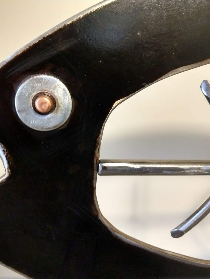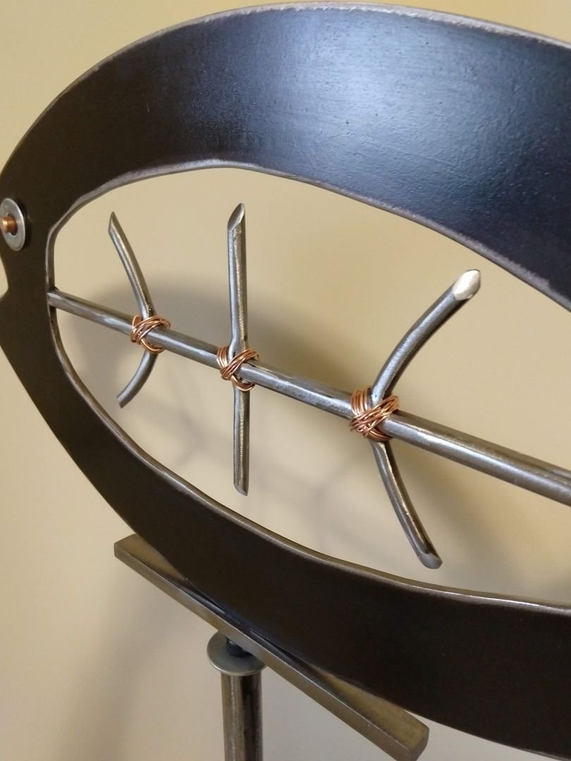 Found object steel, plasma cut, welded, copper accents. Upper fish sculpture telescoped into iron pipe and blackened base.