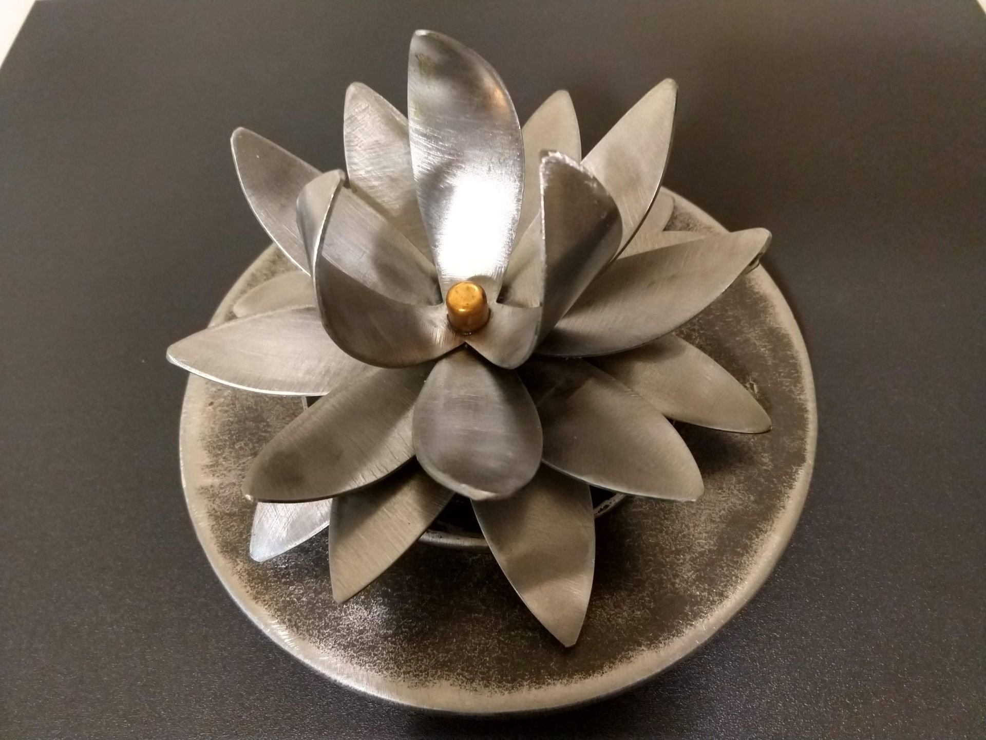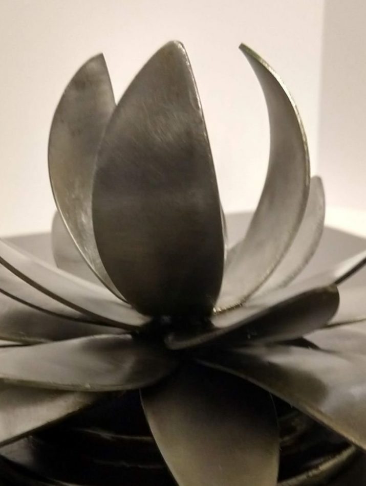Mild steel along with found object base. Plasma cut, welded, clear patina, copper accent